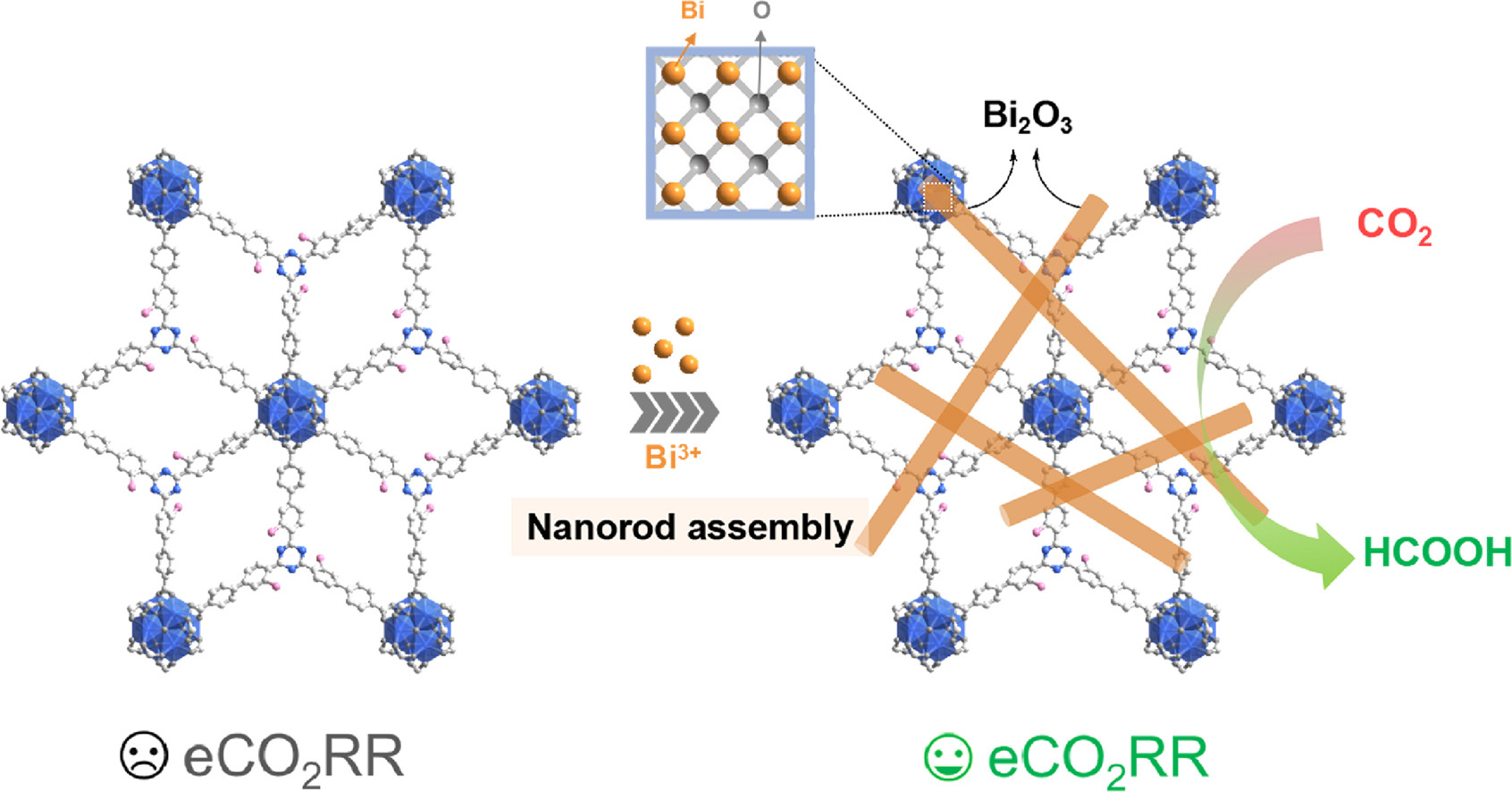 Electrocatalytic carbon dioxide reduction reaction (eCO2RR) represents one of the most promising technologies for sustainable conversion of CO2 to value-added products. Although metal-organic frameworks (MOFs) can be vastly functionalized to create active sites for CO2RR, low intrinsic electrical conductivity always makes MOFs unfavorable candidates for eCO2RR. Besides, studies on how to regulate eCO2RR activity of MOFs from linkers' functionalities viewpoint lag far behind when compared with the assembly of multinuclear metal-centered clusters. In this work, non-toxic bismuth(III) oxide (Bi2O3) was incorporated into a series of two-dimensional (2D) MOFs (ZrLX) established from Zr-oxo clusters and triazine-centered 3-c linkers with different functionalities (LX = 1–5) to give composites ZrLX/Bi2O3. To investigate how functionalities on linkers distantly tune the eCO2RR performance of MOFs, electron-donating/withdrawing groups were installed at triazine core or benzoate terminals. It is found that ZrL2/Bi2O3 (‒F functionalized on triazine core) exhibits the best eCO2RR performance with the highest Faradaic efficiency (FE) of 96.73% at −1.07 V vs. RHE, the largest electroactive surface (Cdl = 4.23 mF cm−2) and the highest electrical conductivity (5.54 × 10−7 S cm−1), highlighting tuning linker functionalities and hence electronic structure as an alternative way to regulate eCO2RR.