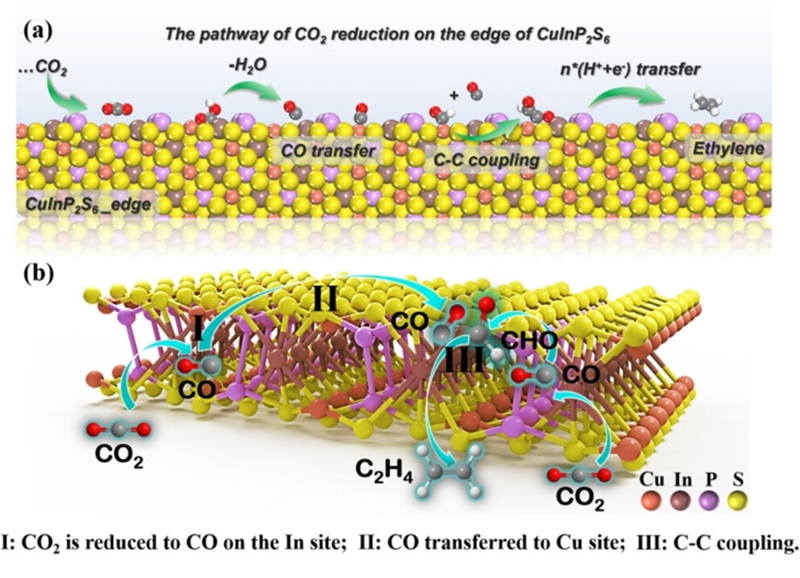 In summary, the ultrathin multimetallic phosphochalcogenide photocatalysts exhibit excellent photocatalytic activity. Among them, the ultrathin structure can provide more active sites, which is conducive to CO2 adsorption and activation, while the Cu–In dual sites act as tandem catalytic sites to accelerate C=O bond activation and C–C bond coupling. Despite this research has immense scientific value and theoretical significance for achieving carbon emission reduction and resource utilization of CO2 as well as guiding the design and preparation of highly efficient multimetallic 2D layered catalysts, the bottlenecks of large-scale preparation and the considerations on cost, stability and longevity of these 2D catalysts for industrial applications still remain a significant challenge. Furthermore, improving product selectivity and integrating such catalytic processes into existing industrial systems will make a substantial contribution to sustainable industrialization.