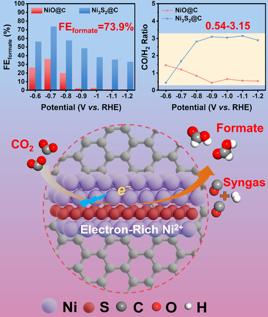 Rationally constructed new catalyst can promote carbon dioxide reduction reaction (CO2RR) to valuable carbonaceous fuels such as formate and CO, providing a promising strategy for low CO2 emissions. Herein, the synthesized Ni3S2@C as a highly efficient electro-catalyst exhibits remarkable selectivity for formate with 73.9% faradaic efficiency (FE) at −0.7 V vs. RHE. At high applied potential, it shows a high syngas evolution with CO/H2 ratios (0.54–3.15) that are suitable for typical downstream thermochemical reactions. The experimental and theoretical analyses demonstrate that the electron-rich Ni2+ in Ni3S2 enhances the adsorption behavior of ∗OCHO intermediate, reduces the energy barrier of the formation of intermediates, and improves the selectivity of the formate product. Attenuated total reflection surface-enhanced infrared absorption spectra conducted in situ show that ∗OCHO intermediate is more likely to be generated and adsorbed on Ni3S2, enhancing the selectivity and activity of the formate product.