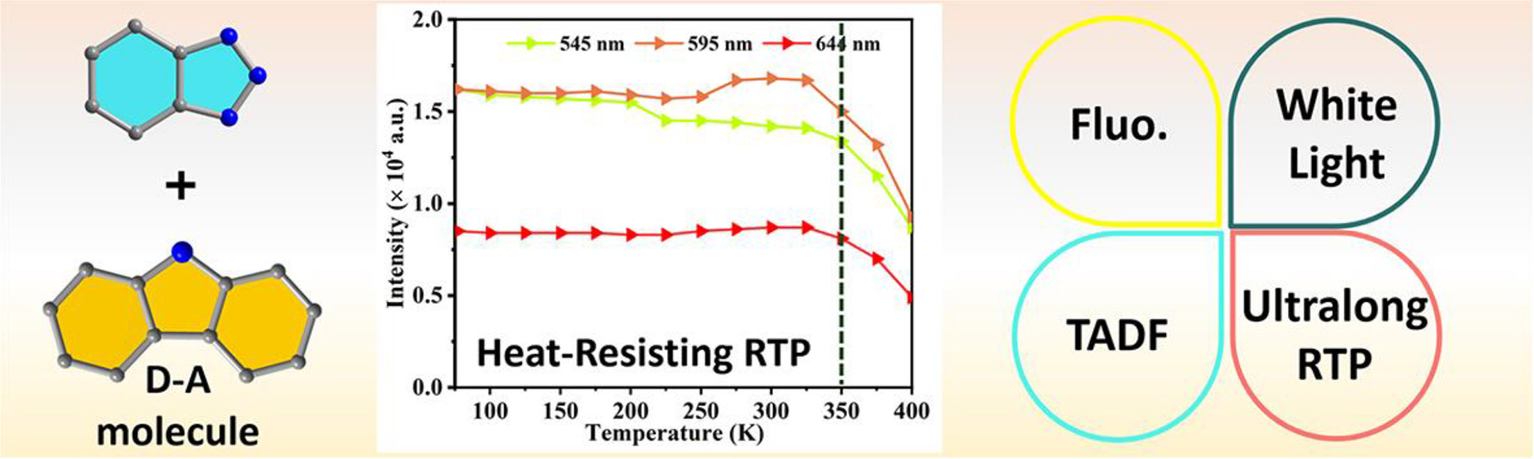Achieving high heat-resisting room temperature phosphorescence (RTP) performance and robust white emission from pure small molecules is a meaningful but challenging work. Herein, a simple donor-acceptor (D-A) molecule, 9-(1H-benzotriazol-1-ylmethyl)-9H-carbazole (CzBtrz), was investigated. This simple molecule not only exhibits multiple emissions including white light, thermally activated delayed fluorescence (TADF) and ultralong RTP with a lifetime of 988.54 ms at 545 nm, but also shows superhigh heat-resisting phosphorescence property which can maintain stability in a large temperature region from 77 to 350 K (ΔT = 273 K), exceeding those of other RTP systems. Meanwhile, this molecule shows the time-evolved dynamic RTP. The experimental and theoretical analyses from CzBtrz crystal demonstrate that the intramolecular charge transfer (ICT) interaction and molecular stacking play an important role in the generation of RTP. Therefore, this work provides an efficient strategy to design ultrahigh heat-resistant RTP, ultralong RTP and single-phased white-light emitting materials.