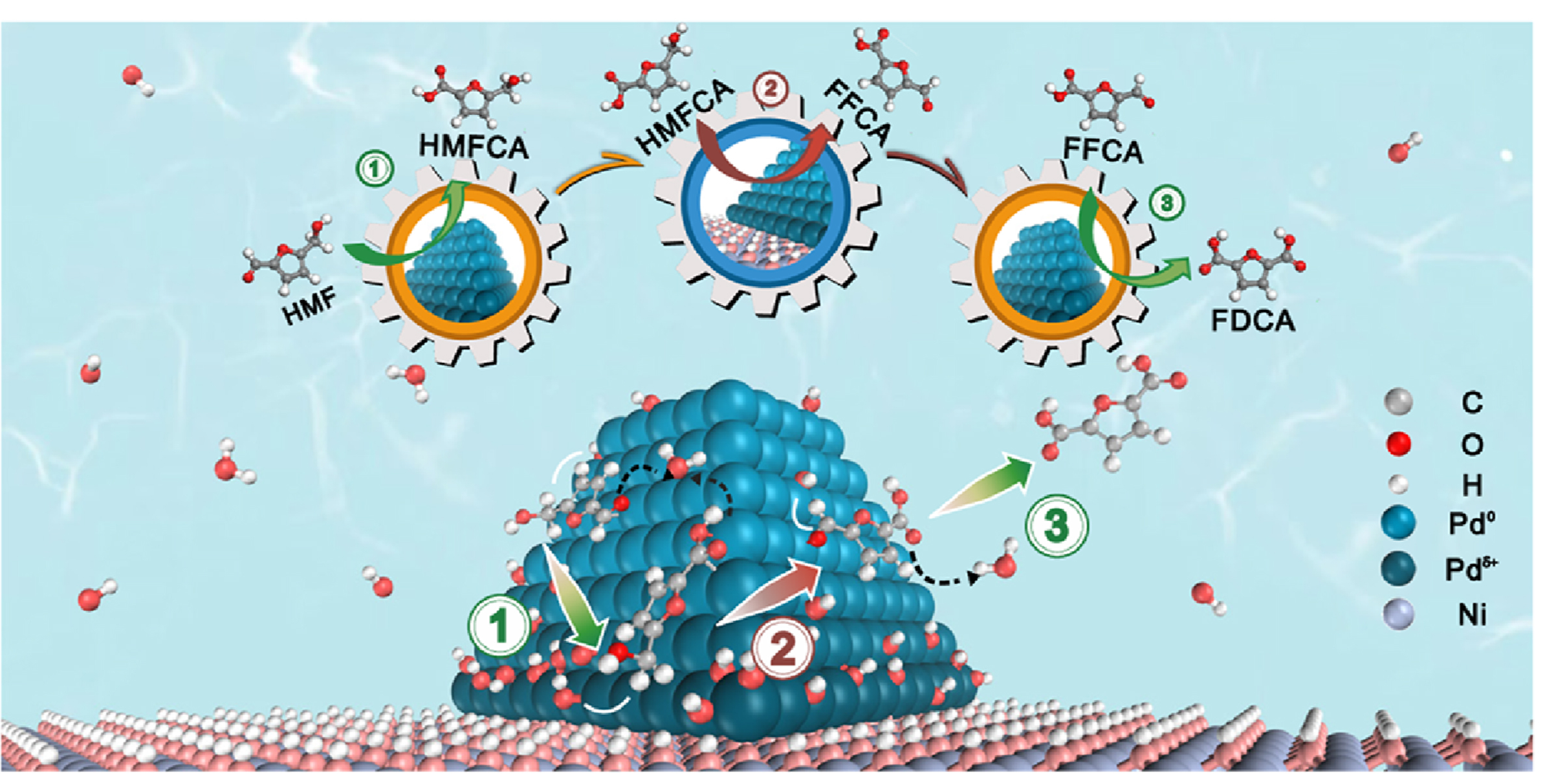 low-potential HMFOR with ~100% FDCA selectivity. At Ni2+–O–Pd