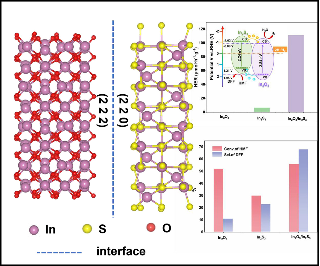 Solar light driven hydrogen production from water splitting and oxidation of biomass-derivatives is attractive for the conversion of solar energy to high value-added chemicals. The fabrication of heterostructure photocatalysts with matched band structure between two semiconductors is a promising approach for efficient photocatalysis. In this work, a novel In2O3/In2S3 heterostructured hollow fiber photocatalyst was successfully fabricated through two-step ion exchange and chemical bath deposition methods, where the In2S3 nanoparticles (NPs) anchored on the surface of In2O3 hollow fibers via strong interfacial interaction between the In2O3 (222) and In2S3 (220) facets. The photocatalyst was used for efficient visible-light-driven photocatalytic hydrogen production integrated with selective oxidation of 5-hydroxymethylfurfural (HMF) to 2,5-diformylfuran (DFF). Compared with pristine In2O3 and In2S3, the optimal In2O3/In2S3 heterostructure exhibits an enhanced photocatalytic hydrogen production rate (111.2 μmol h−1 g−1), HMF conversion efficiency (56%) and DFF selectivity (68%) under visible light irradiation. The experimental and theoretical investigations illustrate the phase interface between well matched In2O3 (222) and In2S3 (220) facets gives rise to facilitated photogenerated charge separation and transfer. This study presents the development of high-performance heterostructured photocatalysts for high efficient hydrogen production coupled with biomass oxidation.