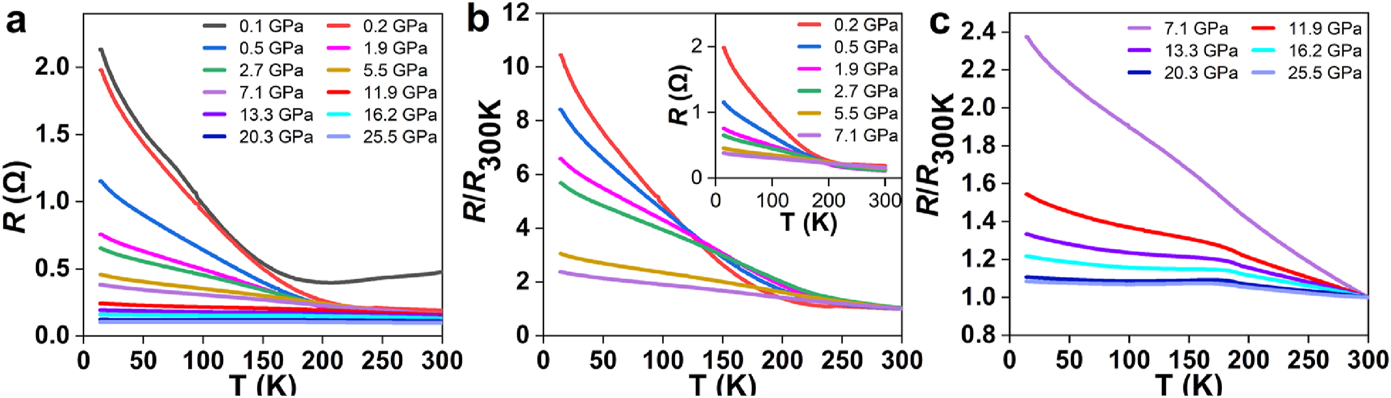 In conclusion, we collected SAED patterns from different orientations to fit the lattice parameters, demonstrating R-3 space group for α-RuI3. Density functional theory calculations were employed to discuss the energy advantage of 3R and 2H phases under various pressures, with the former showing lower energy than the latter under the synthesized pressure. Moreover, the ΔH-P curves imply that the 2H phase will emerge at approximately 11 GPa. Furthermore, the in-situ pressure-dependent resistance measurements reveal the metallic behaviour up to 25.5 GPa. Upon cooling from room temperature, the resistance increases first slowly and then rapidly at low pressure. Above 11.9 GPa, the resistance behaviour undergoes a great change—it initially increases fast and then slightly almost independent of temperature. The calculated electronic structure under HP shows semi-metallic behaviour, consistent with the experimental observation. Furthermore, the pressure point, where resistance behaviour dramatically changes, is close to the calculated one when P-31c structure emerges, indicating that the resistance changes may be driven by pressure-induced structure transformation. Our work clarifies the detailed structure of α-RuI3 and gives an in-depth investigation of its electrical transport behaviour under HP.
