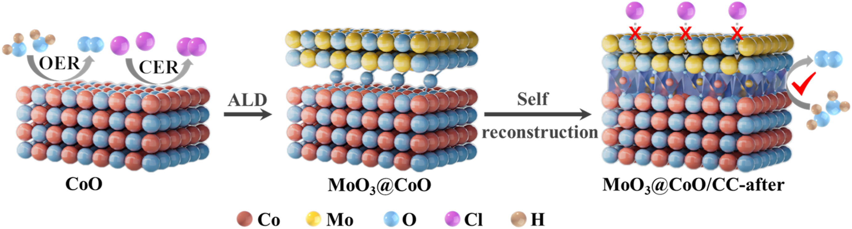In conclusion, MoO3-restricted CoMo-LDH exhibits excellent OER activity and stability in seawater electrolysis. The regulation of the interface by this ultrathin MoO3 layer promotes the formation of CoMo-LDH as the highly active phase. Furthermore, the in-situ formation of the MoO3 layer plays a crucial role in shielding Cl from the catalytic active interface, decelerating the corrosion rate of the catalyst. Collectively, this study not only developed a potent and stable catalyst for leveraging vast seawater resources in substantial hydrogen production but also revealed a mechanism for constrained dynamic surface reconstruction, thus providing valuable insights for designing efficient and robust LDH-type catalysts.