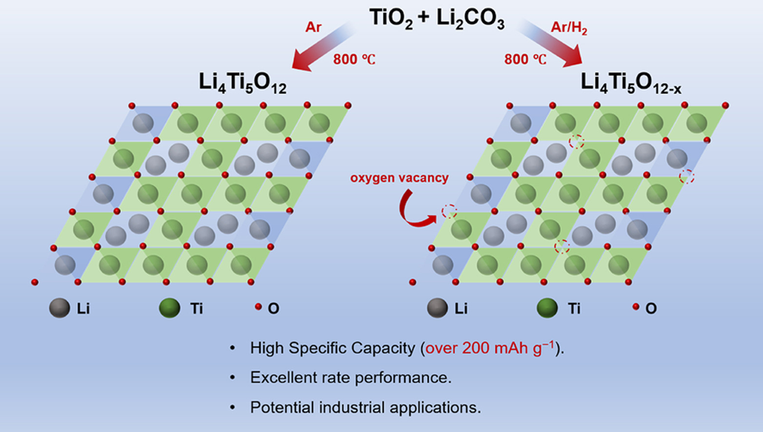 The zero-strain spinel Li4Ti5O12 stands out as a promising anode material for lithium-ion batteries due to its outstanding cycling stability. However, the limited theoretic specific capacity, low Li+ diffusion coefficient and electronic conductivity severely hinder its practical application. In this study, we demonstrate a strategy of introducing abundant oxygen vacancies not only on the surface and but also inside the bulk of Li4Ti5O12 particles via reductive thermal sintering. The oxygen vacancies can significantly enhance the electronic conductivity and lithium-ion diffusion coefficient of Li4Ti5O12, leading to a remarkable improvement in rate performance and a reduction in polarization. Moreover, additional lithium-ion accommodation sites can be created at the defective surface, contributing to a high specific capacity of over 200 mAh g−1.
