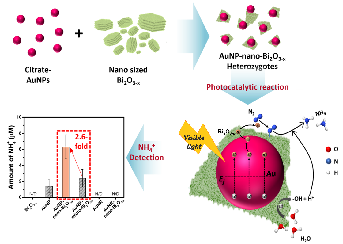 The advancement in catalysis techniques for sustainable environmental applications, particularly an alternative to the current Haber-Bosch process for NH3, has recently gained widespread attention. Although photocatalytic conversion of N2 to NH3 using solar energy is an eco-friendly method, it has the limitation of low quantum yield. Recently, 2D Bi-based photocatalysts which exhibit higher visible light absorption than TiO2 and higher stability than MXene have been an active research topic, and their performance can be enhanced through improved visible light absorption properties by incorporating plasmonic gold nanoparticles while nitrogen adsorption could be enhanced through oxygen vacancy (OV) processes. In the present study, we explore the application of 2D nano-sized Bi2O3–x and gold nanoparticles for visible light photo generation of NH3. HRTEM and XPS reveal that the formation of AuNP and nano-sized Bi2O3–x in AuNP/Bi2O3–x heterozygote structure promotes the charge carrier mobility and charge transport at the interface, resulting in a 2.6-fold increase in the photocatalytic activity compared to micro-sized Bi2O3–x with AuNP. The improved photocatalytic performance can be ascribed to significant enhancement of visible light absorption by plasmonic nanoparticles, fast charge transport and mobility (due to sheet morphology) and the N2 activation by OV in AuNP/Bi2O3–x heterozygote. Through a systematic experimental investigation involving catalysts, concentration, pH, and scavengers, the highest photocatalytic performance was achieved with the heterozygote structures of AuNP/n-Bi2O3–x under optimized conditions, yielding 432.5 μmol gcat−1 h−1 of NH3.