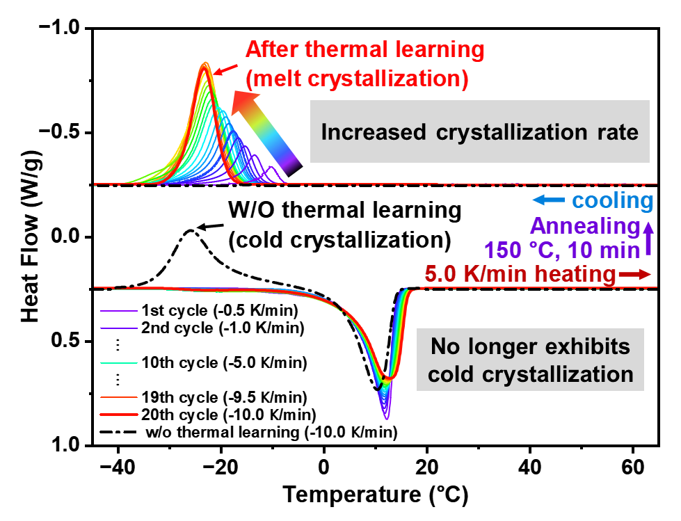 Bio-polyol is considered as a core material to synthesize eco-friendly polyurethane products. However, one of the popular bio-polyols, polytrimethylene ether glycol (PO3G), is reluctant to crystallize and therefore exhibits a cold crystallization behavior. This abnormal behavior causes unstable mechanical properties at low-temperature and limits its applications in shape memory devices where crystallization is an essential mechanism. To analyze the unusual phenomenon, we compared different ether polyols focusing on symmetry characteristics and the even-odd effect of carbon backbones. It is found that PO3G has a slow crystallization rate because its ether linkages require specific chain arrangement for attractive interactions. Consequently, a thermal learning mechanism is developed to restore the normal crystallization behavior of elastomers synthesized from the bio-polyol. Repetitive heating and cooling cycles with high-temperature annealing induce urethane exchange reaction and reconstruct the chain orientations for fast crystallization. Results suggest the degree of crystallizations in polyurethane elastomer can be precisely controlled by introducing repetitive thermal treatments to enhance the potential applications of bio-polyols in polymer industries.