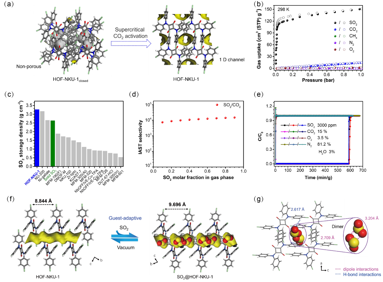 In conclusion, highly efficient SO2/CO2 separation has been achieved by HOF-NKU-1 through GA and SM effect. The storage density of SO2, selectivity, and dynamic capture of SO2 at high humidity conditions exceeds the reported benchmark materials. In addition, HOF-NKU-1 can be recycled and reused through simple recrystallization, resulting in significant material cost savings. Therefore, this work not only provides a new direction for gas separation and storage, but also provides a basis for the discovery of more HOF materials with other functions in the future. Future research can focus on: (1) validation of the large-scale synthesis, long-term cycling stability, and economics; (2) developing dynamic in-situ characterization techniques to reveal the molecular mechanisms of the GA effect; (3) exploring the versatility of HOFs in the separation of other acidic gases (such as NOx). The emergence of such flexible porous materials may provide a new paradigm for the next generation of green chemical technologies.