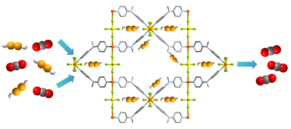 Due to the similar physicochemical properties of acetylene (C2H2) and carbon dioxide (CO2), separating C2H2 from a CO2/C2H2 mixture poses a significant challenge in the petrochemical industry. Herein, we successfully synthesized a novel SiF62− anion pillared cage metal-organic framework ZNU-15 possessing a new crs topological structure for the selective capture of C2H2. As a linear bidentate linker, the fluorinated SiF62− anion partitions the pores into various sized cages. ZNU-15 displays moderate adsorption for C2H2 with a capacity of 36.0 cm3 g−1 at 298 K and 1 bar, which is 2.7 times higher than the CO2 uptake. The IAST selectivity of C2H2/CO2 for ZNU-15 at 298 K and 100 kPa is 10.5, surpassing that of most reported materials. The Qst values for C2H2 and CO2 at zero coverage are 54.0 and 42.8 kJ mol−1, respectively. Moreover, breakthrough experimental tests show that ZNU-15 is capable of effectively separating C2H2 from a C2H2/CO2 mixture. Theoretical calculations further indicate that C2H2 is preferentially trapped by the small cage with four cooperative hydrogen bonds.