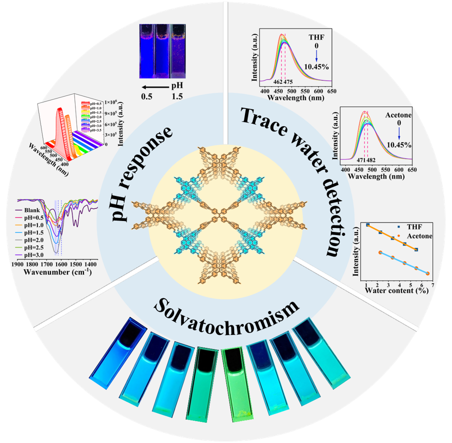 Stimuli-responsive two-dimensional (2D) covalent organic frameworks (COFs) with precise structures and permanent porosity have been employed as platforms for sensors. The slight change of the backbones inside the framework leads to different electronic states by external stimuli, such as solvent, pH, and water. Herein, we introduced an alkynyl-based building block (ETBA) with high planarity to synthesize two imine-based alkynyl-COFs (ETBA-TAPE-COF and ETBA-PYTA-COF) with high yield, good crystallinity, and chemical stability. Due to the presence of acetylene bonds, ETBA-TAPE-COF does not adopt the completely overlapping AA stacking mode. Slight interlayer displacement occurs along the parallel direction relative to the acetylene linkages, which facilitates lower configurational energy. Additionally, the introduction of pyrene group contributes to high π-electron mobility of ETBA-PYTA-COF. The interactions between electron-withdrawing group (ETBA) and electron-donating group (PYTA) during processes of protonation and intramolecular charge transfer (ICT) endow ETBA-PYTA-COF with excellent acidochromic and solvatochromic properties, respectively. Based on this, a fluorescence sensor is successfully established, which can be used for rapid response to trace amounts of water in organic solvents. In contrast, ETBA-TAPE-COF does not exhibit these photophysical properties due to its higher HOMO–LUMO gap compared to ETBA-PYTA-COF. This work proposes a new strategy for designing and preparing COFs with unique photophysical properties without introducing additional functional groups.