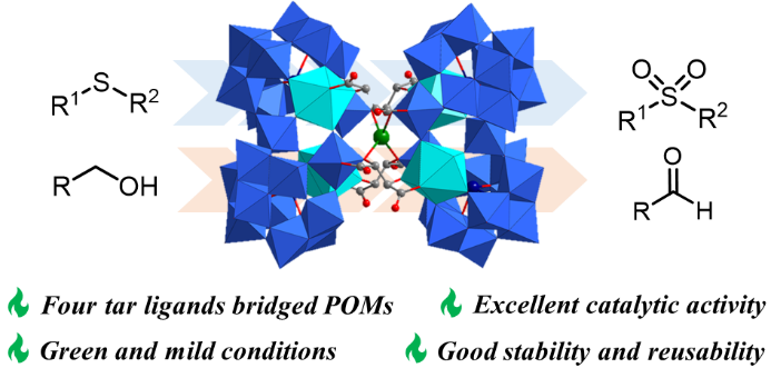 A novel tetra-europium(III)-containing antimonotungstate, Na8.2[H2N(CH3)2]9[Na10.8(tar)4(H2O)20(Eu2Sb2W21O72)2]·44.5H2O (EuSbW, H4tar = DL-tartaric acid), has been synthesized and characterized. The dimeric polyoxoanion of EuSbW consists of two Dawson-like {Eu2Sb2W21} units bridged by four DL-tartaric acid ligands. The adjacent carboxyl and hydroxy groups in each tartaric acid simultaneously chelate with W and Eu atoms from different {Eu2Sb2W21} units, thereby forming the dimeric structure. EuSbW represents an extremely rare polyoxometalates where four tartaric acid ligands function as connectors to bridge two {Eu2Sb2W21} units. Additionally, EuSbW exhibits excellent catalytic activity and reusability in the oxidation of thioethers and alcohols, achieving 100% conversion and >99% selectivity for various thioethers, and 85-100% conversion with 90-99% selectivity for diverse alcohols under mild conditions.