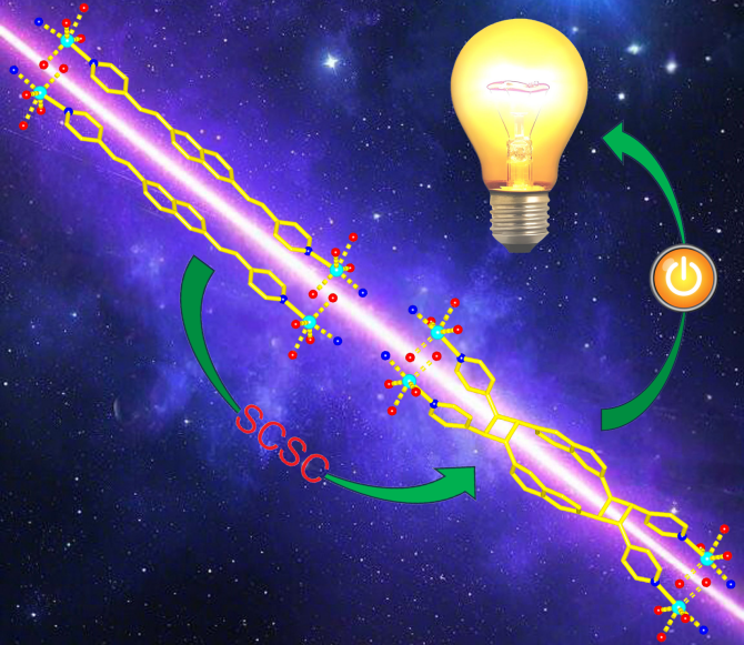Flexible circuit switches have been widely used in electronic devices due to their outstanding flexibility and operability. In order to expand the types of flexible circuit switch materials, we develop a unique composite material, which integrates a photoresponsive flexible substrate derived from a photoreactive coordination polymer (CP) with an elastic conductive adhesive tape (CAT) in this work. The photoreactive CP {[Cd(2,6-bpvn)(3,5-DBB)2]·DMF}n (1) is prepared through solvothermal reaction of Cd(NO3)2·4H2O with 2,6-bis((E)-2-(pyridin-4-yl)vinyl)naphthalene (2,6-bpvn) and 3,5-dibromobenzoic acid (3,5-HDBB). Upon irradiation with UV light, crystals of 1 can undergo [2+2] photocycloaddition reaction and exhibits photomechanical movements. The crystalline powder of 1 can be uniformly distributed in polyvinyl alcohol (PVA) to generate the composite film 1-PVA. After pasting a piece of CAT on the surface of a 1-PVA film, a conductive two-layer film of 1-PVA/CAT can be fabricated. This film bends rapidly upon UV light exposure, connecting the circuit and causing the bulb to light up. When the light source is removed, it reverts to its initial state and the circuit is disconnected and the bulb is extinguished. This process can be cycled at least 100 times, achieving precise turn-on and turn-off performances of the photocontrollable circuit switch.