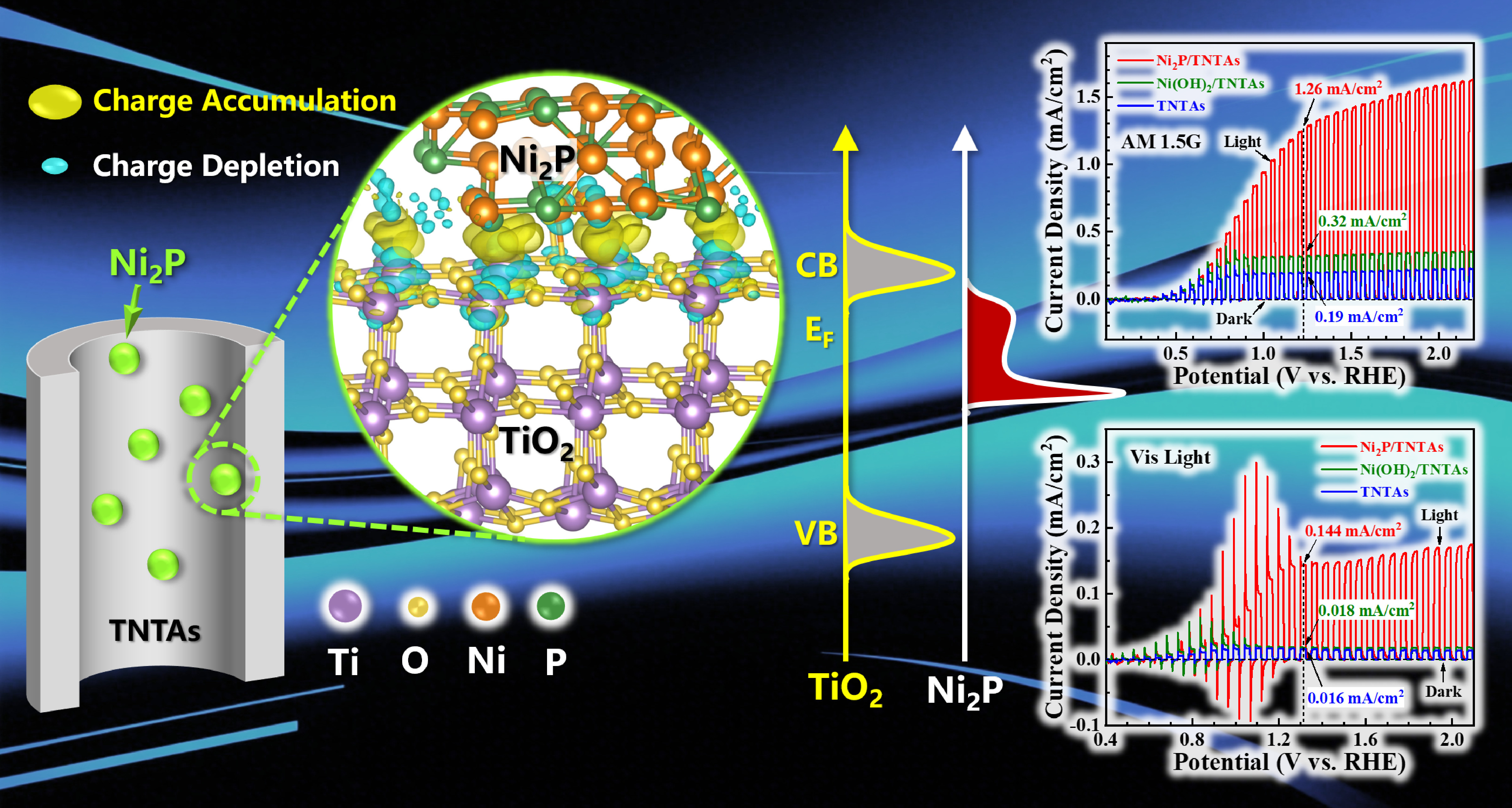 Photoelectrochemical (PEC) hydrogen production holds great promise for applications in energy production. A novel strategy characterized by simplicity, stability, and high efficiency was developed to significantly boost the PEC performance of TiO2 (anatase) nanotube arrays (TNTAs). This strategy entailed a series of treatments, including a conventional anodic oxidation (etching) process, a primary annealing treatment, and a secondary annealing treatment via impregnation. As a result, Nickel phosphide (Ni2P) was composited onto well-ordered titanium dioxide (anatase) nanotube array photoanodes (Ni2P/TNTAs), which exhibit hugely improved PEC hydrogen generation performance. A thorough and systematic investigation was conducted to comprehensively analyze the morphology, semiconductor band-gap structure, and PEC hydrogen production performance of the Ni2P/TNTAs composites. The experimental results demonstrated that under identical experimental circumstances, the measured photocurrent density of the Ni2P/TNTAs photoanode exhibited a 6.63-fold increase relative to that of the TNTAs. The hydrogen production rate of Ni2P/TNTAs reaches 182.96 μmol/cm2, 6.10 times higher than that of the pure TNTAs. The excellent interfacial charge transfer pathway at the Ni2P/TiO2 interface promoted photogenerated carrier separation and electron transfer from TiO2 to Ni2P. This method offers a valuable reference for designing highly efficient PEC hydrogen-production catalysts.