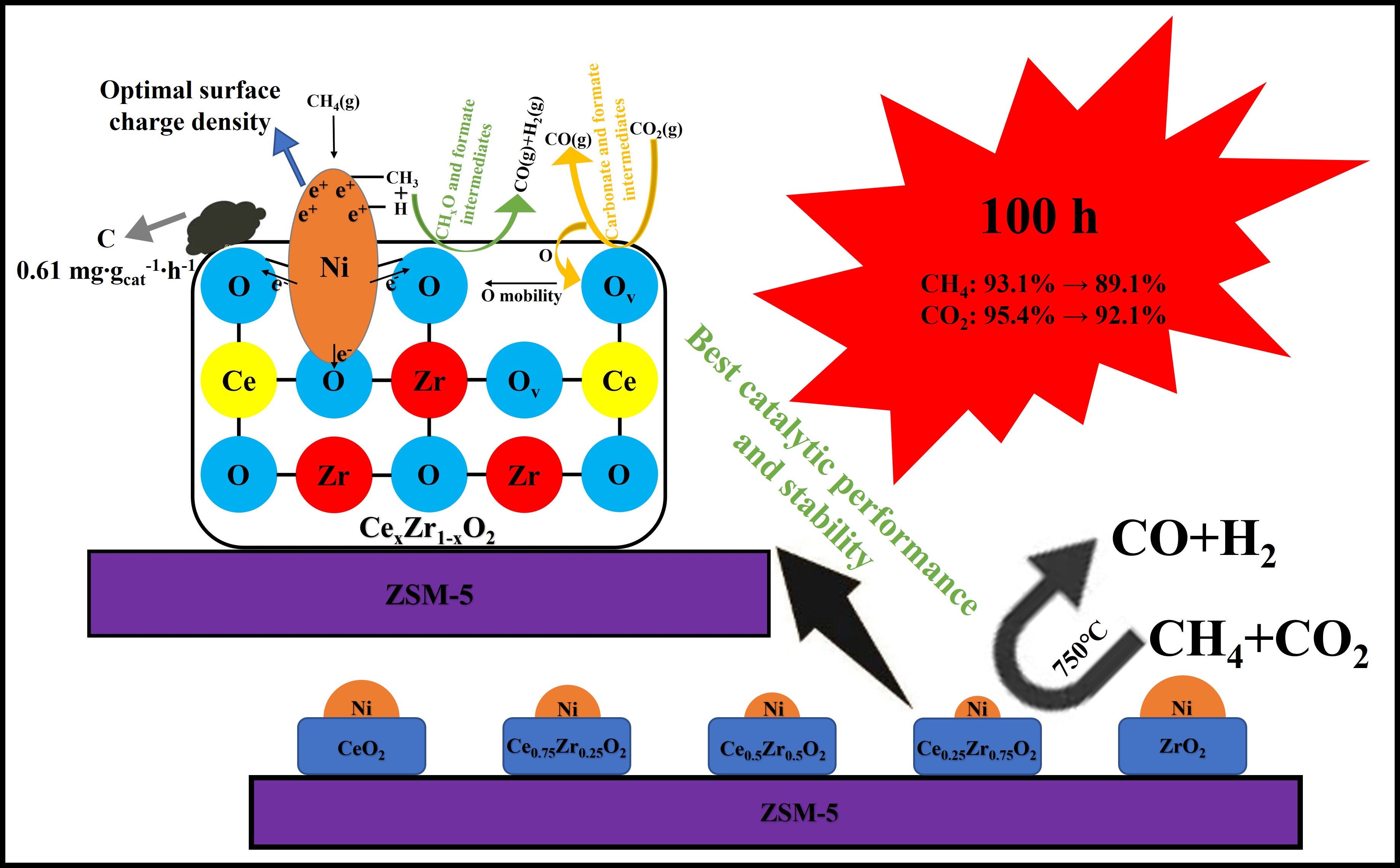 Methane dry reforming (DRM) has gained significant attention as a promising route to convert two major greenhouse gases (CO2 and CH4) to syngas. The development of efficient catalysts is critical for the engineering applications. In this study, the CexZr1-xO2/ZSM-5 composites with different oxygen vacancy concentrations were synthesized by tuning the Ce/Zr ratio, followed by the deposition of metal Ni to the island-like CexZr1-xO2 on the ZSM-5, forming a variety of Ni-CexZr1-xO2/ZSM-5 catalysts, which were applied for the methane dry reforming reaction under 750°C. Combined with various characterizations, it was found that the oxygen vacancy concentration illustrated the volcanic tendency with the decreased Ce/Zr ratio, and the interaction between metal Ni and CexZr1-xO2 exhibited a positive relationship with oxygen vacancy concentration. The enhanced between Ni and CexZr1-xO2 interaction could improve the strength and amount of Ni-O-M (M=Ce/Zr) species, making the d-band centers of catalysts closer to the Fermi energy level, which was beneficial to the CH4 and CO2 activation, along with the improved capacity to resist sintering and coking. Especially, the C1Z3 (Ni-Ce0.25Zr0.75O2/ZSM-5) catalyst with the Ce/Zr ratio of 1/3 demonstrated the optimal catalytic performance with 91.9% CH4 and 93.8% CO2 conversions within 50 h, accompanied by the best structural and catalytic stability after 100 h. In-situ DRIFTS was employed to study the reaction path and mechanism, discovering that significant amounts of strengthened Ni-O-M species were conducive to activating adsorbed CH4 and CO2, and desorbing the linear CO species.