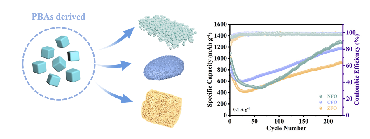 Transition metal oxides (TMOs) have received extensive attention for their unique physical and chemical properties. It is worth noting that Fe-based materials stand out because of their rich natural resources, low toxicity, low price and other advantages, but at the same time there are problems of capacity attenuation and volume expansion. Here, a universal synthesis method of MO/MFe2O4 (M = Ni, Cu, Zn) nanomaterials derived from Prussian blue analogues (PBAs) is proposed based on the self-sacrificing template strategy of metal-organic frameworks (MOFs). The calcinated products retain the porous structure and small particle size of PBAs, which shorten the ion transport path, provide abundant electroactive sites and void space, effectively alleviates the effect of volume expansion, and improves the reaction kinetics. These MO/MFe2O4 anode materials exhibit excellent cyclic reversibility and stability during repeated charge/discharge process, among them, NiO/NiFe2O4 showed the best electrochemical performance, retaining a superior specific capacity of 1301.7 mAh g-1 following 230 cycles at 0.1 A g-1. In addition, the lithium adsorption capacity of the materials was further explored through the calculation of density functional theory (DFT). The research perspectives and strategies reported in this paper have strong universality and offer innovative insights for the synthesis of alternative advanced materials.