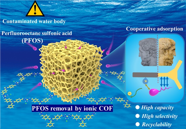 Per-and polyfluoroalkyl substances (PFAS) are persistent environmental contaminants that often show an adverse impact on human health. Rational design of porous adsorbents for selective and reversible removal of PFAS, such as perfluorooctane sulfonate (PFOS), is imperative and challenging. Herein, a Janus strategy based on an ionic covalent organic framework (iCOF-DGCl) composed of the alternately hydrophobic aromatic domains and hydrophilic guanidinium moieites has been proposed to meet the requirement of high-performance adsorbents. iCOF-DGCl shows fast adsorption kinetics (970.9 mg g-1 min-1) and ultrahigh uptake capacity (2491 mg g-1) toward PFOS, making it one of the most effective materials among the reported PFOS adsorbents. Moreover, the PFOS removal by iCOF-DGCl remains highly selective in the presence of disturbing anions, and the adsorbent could be well recovered for reuse. Mechanism studies have demonstrated that the Janus structure units of iCOF-DGCl form both hydrophobic and electrostatic interactions with the amphiphilic PFOS, thus achieving cooperative adsorption of PFOS. This work provides a facile approach based on Janus structure of COFs adsorbent for wastewater remediation.