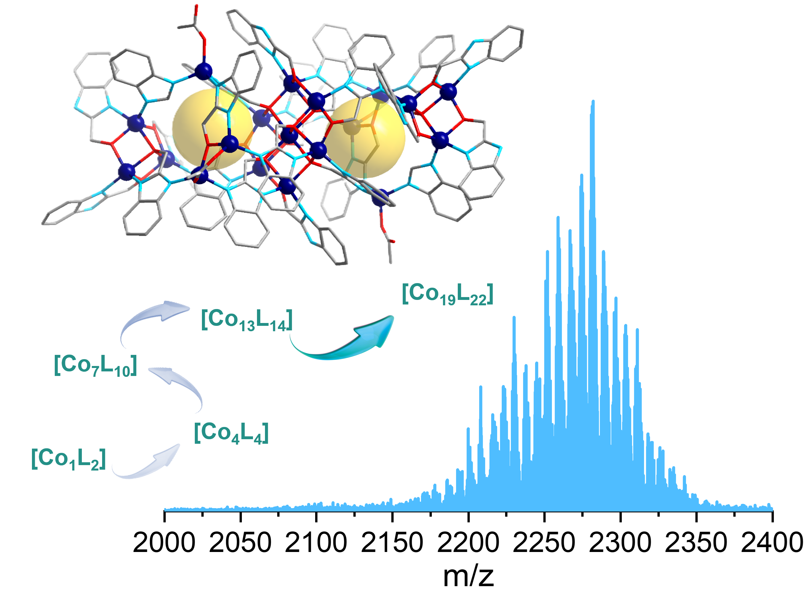 Odd-numbered and high-nuclearity coordination clusters are extremely rare, yet they represent an intriguing subclass lacking regular repeating building blocks and high structural symmetry for understanding self-assembled multiatomic systems. Herein, the largest cobalt and polydentate ligand based cluster featuring odd-nuclearity, namely [Co19(HL1)8(L1)12(L′)2(Ac)4]·10CH3CH2OH·6H2O (1, H2L1 = 1H-benzo[d]imidazole-2-yl)methanol, HL′ = 1H-benzo[d]imidazole), was obtained with in-situ ligand transformation from H2L1 to L′. It features a hierarchical trilayer and void-cage inside structure, consisting of central disc-shaped [Co7L10] core with two [Co6] rings on both sides. ESI-MS of crystal 1 yields a series of more than sixteen fragments, all featuring an integrated [Co19] core, suggesting stability of the polynuclear cluster in solution. During increased in-source energy from 0 to 100 eV, all MS peaks shifted to a lower m/z range, but the [Co19] core remained intact, excepting for the stepwise elimination of up to three Ac- anions or three L1 linkers. PXRD tracking of the reaction sediments showed the formation of a key precursor of [Co4L4] cubane at 3 h, and its content decreased at 6 h and vanished at 12 h, followed by the appearance of crystals 1 by generation of a clear solution at 18 h, suggesting an initial cluster assembly-disassembly process. ESI-MS spectra analysis of both reaction sediment and solution further identify the existence of other crucial higher-nuclearity reassembled fragments of [Co7L10] disk and its expansion of [Co13L12(L′)2]. A probable tandem assembly-disassembly-reassembly mechanism is put forward as [CoL2]→[Co4L4]→[Co7L10]→[Co13L12(L′)2]→[Co19L20(L′)2]. Their evolution also indicated the ingenious synergy of coexisting organic, inorganic and in-situ generated ligands, along with diverse coordination geometries of metal ions, plays a directional role in formation of odd-numbered and high-nuclearity coordination clusters. Magnetism analysis revealed antiferromagnetic coupling play dominated role in the cluster.