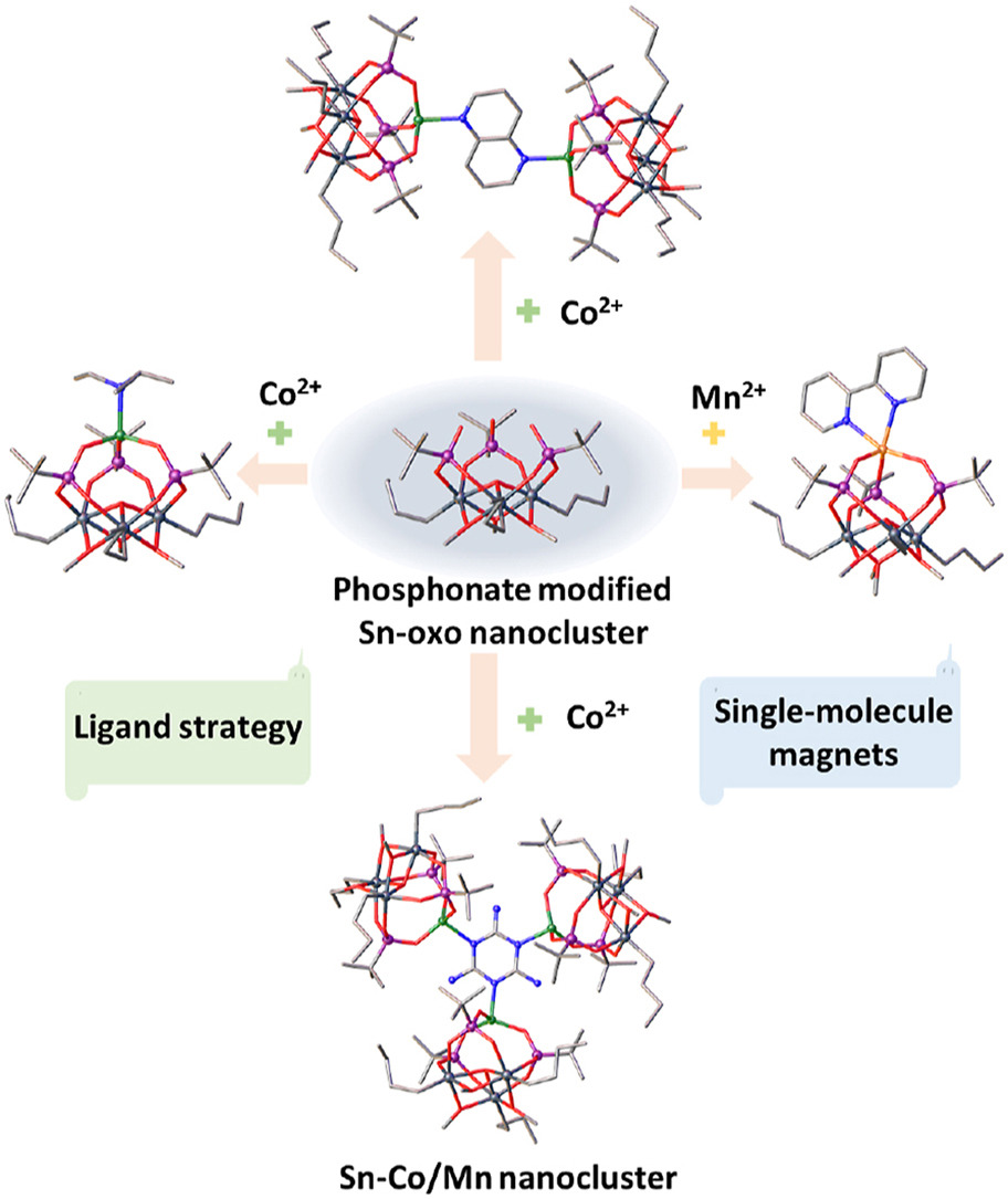 In conclusion, the synthesis of nine heterometallic Sn-Co/Mn nanoclusters has been achieved through a stepwise self-assem bly approach, utilizing polynuclear oxygen donors as key precur sors. The tBuPO32− ligands play a pivotal role in bridging trinuclear organotin clusters with Co2+/Mn2+ ions. Shielded by O/N/P-con taining ligands, the Co2+ and Mn2+ ions assume distorted tetrahe dral and hexahedral coordination environments, respectively. Lig ands featuring two or three N/P coordination sites facilitate the bridging of multiple [(nBuSn)3(MeO)3(μ3-O)(tBuPO3)3Co] substruc tures, highlighting their structural robustness. Significantly, the dy namic magnetization measurements indicated that (Sn3-Co1)2-1,5-naphyd NC exhibits a slow relaxation behavior of magnetiza tion. This study delves into the intricate self-assembly process of Sn-Co/Mn nanoclusters at the molecular level, offering valuable insights for the development of novel SMMs.