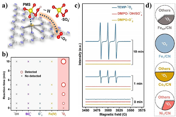 The Fe1/CN catalyst with a loading up to 11.2 wt% is prepared via the supermolecule method.[2] The Fe1/CN catalyst is proved to have atomic dispersion of Fe sites with highly uniform Fe-N4 centers. As a result, compared to CN supported Fe nanoparticles (FeNP/CN) catalysts, Fe1/CN can efficiently activate PMS to generate 1O2 with 100% selectivity (Figure 1a). The sole generation of 1O2 was proved by radical quenching experiments and electron paramagnetic resonance (EPR) tests (Figure 1b-d). The high efficiency and selective generation of 1O2 from Fe1/CN activated PMS can rapidly degrade and mineralize p-chlorophenol (4-CP) with higher apparent rate constants (Kobs) even more than the homogeneous Fe2+ in the PMS system did. Due to the sole generation of 1O2, the Fe1/CN activated PMS system displays stronger resistance to obstruction from natural water, and has wider pH tolerance and better cycle stability. The density functional theory (DFT) calculation results demonstrate that the Fe sites in Fe1/CN tend to adsorb the terminal O of PMS, which can facilitate the oxidization of PMS to form ·SO5-, and thereafter efficiently generate 1O2 with 100% selectivity.