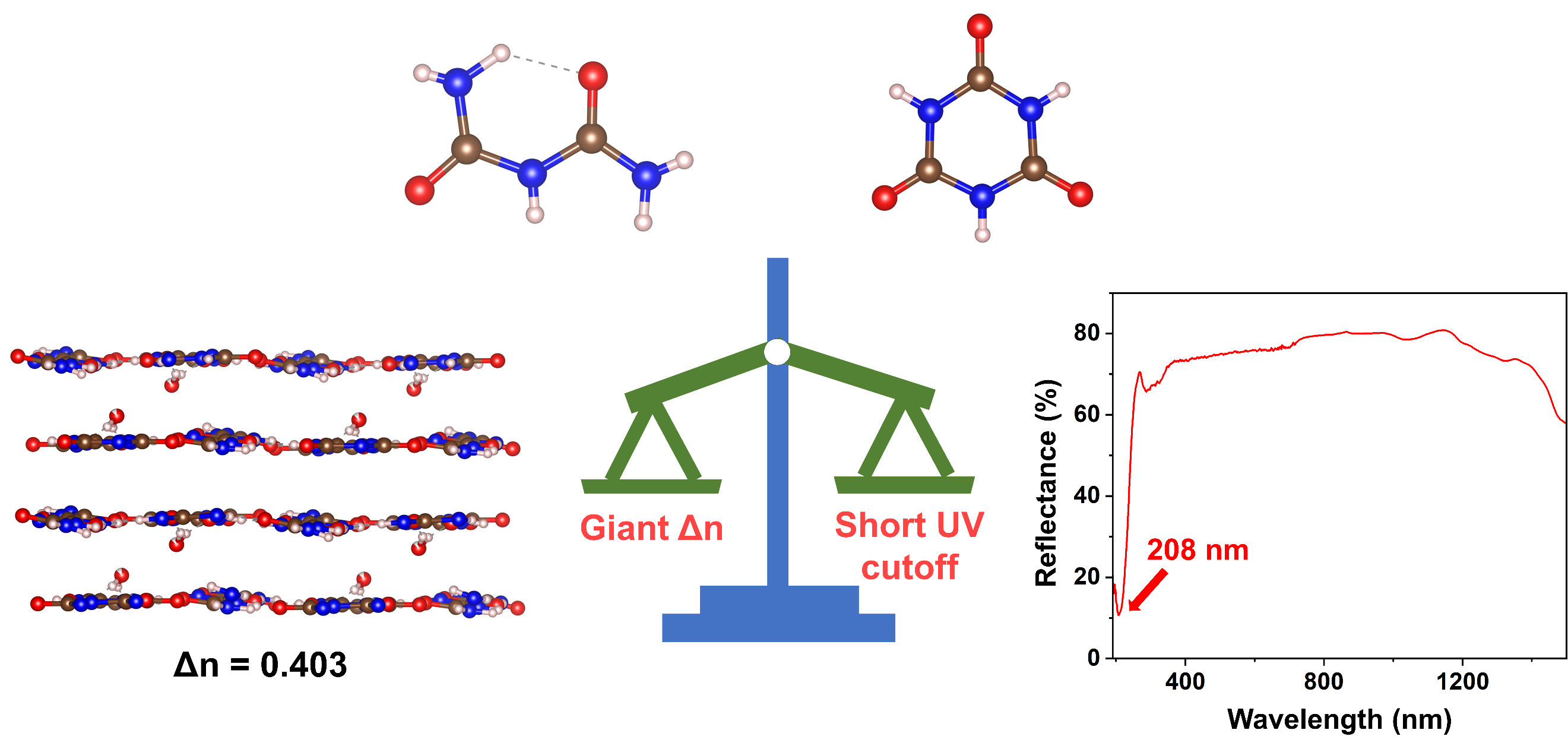 bonding-driven structural optimization, compound 2 achieves a 50% increase in birefringence (Δn = 0.403 @ 546 nm) compared to 1, while retaining a short cutoff edge of 208 nm. This advancement