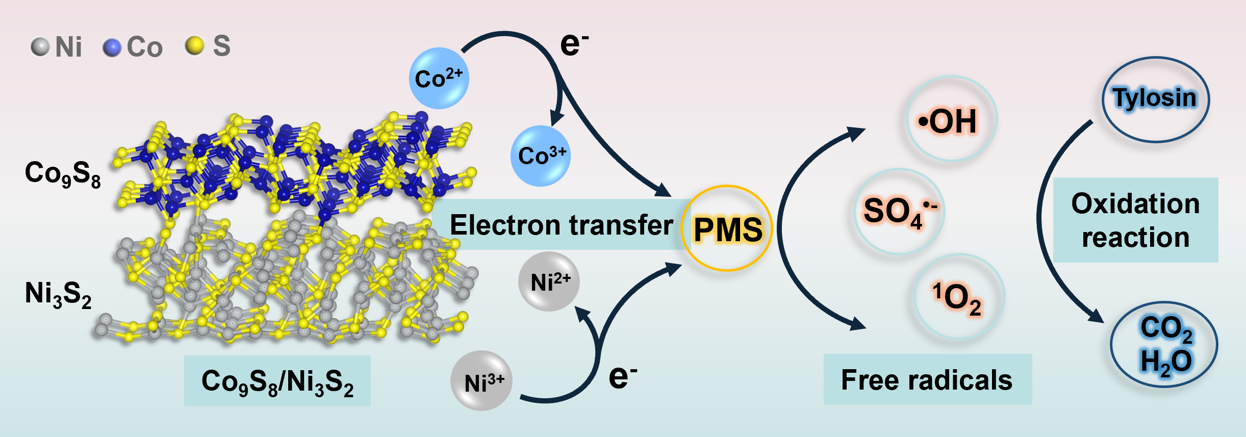 Cobalt-based catalysts for peroxymonosulfate (PMS) activation are often hindered by metal leaching and structural instability, limiting their practical application. To address these challenges, we developed a novel Co9S8/Ni3S2 heterojunction catalyst via a hydrothermal method followed by thermal reduction, employing interface engineering to inhibit metal co leaching. The resulting Co9S8/Ni3S2/PMS system achieved complete tylosin degradation within 120 s. Notably, cobalt leaching was reduced by 4.5 times compared to pure Co9S8, demonstrating significantly enhanced catalyst stability. Furthermore, the system exhibited high efficiency in degrading a variety of antibiotics, good cyclic stability, and strong tolerance to diverse aqueous environments. The enhanced performance is attributed to the interface-engineered heterostructure, which not only improves the structural stability by suppresses metal cation leaching, but also facilitates enhanced PMS adsorption onto the catalyst surface. This improved PMS adsorption, particularly on cobalt active sites, results in substantial electron enrichment, thereby promoting efficient tylosin degradation. This work highlights the importance of interface engineering in designing advanced heterojunction catalysts for stable, and efficient antibiotic wastewater treatment.