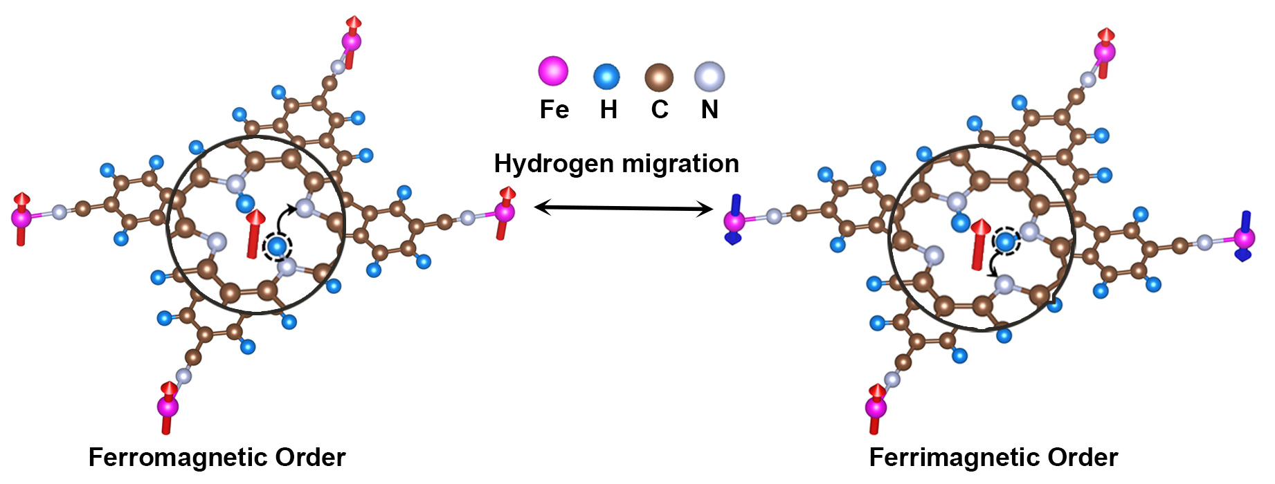 The control of magnetic state is crucial for spintronic applications but remains a significant challenge. Traditionally, controlling magnetic state relies on physical approaches, such as applying external magnetic fields or utilizing spin-orbit coupling. In our previous work, we proposed a novel chemical approach to manipulate the magnetic state of a system through lactim-lactam tautomerization. Here, by first principles calculations, we extend the type of tautomerization to intramolecular hydrogen migration, and reveal that hydrogen migration can modulate magnetic coupling and lead to distinct magnetic configurations in two-dimensional (2D) metal-organic frameworks (MOFs) composed of diradical porphyrinoid and Fe. The migration of hydrogen atoms within porphyrinoid results in four isometric MOFs with notable changes in spin density distribution on organic linkers, which subsequently alters the magnetic coupling between the metal node and organic linkers, leading to ferromagnetic-ferrimagnetic transition in the framework. The magnetic coupling strength also changes significantly, with the Curie temperature enhanced from 5.2 K to 100.1 K. Furthermore, accompanying with the magnetic transition, the MOFs experience an electronic transition from normal half semiconductors (with band gaps of 0.11 and 0.03 eV), where the valence band (VB) and conduction band (CB) share the same spin channel, to bipolar magnetic semiconductors (with band gaps of 0.06 and 0.13 eV), where the VB and CB become fully spin-polarized in opposite directions.