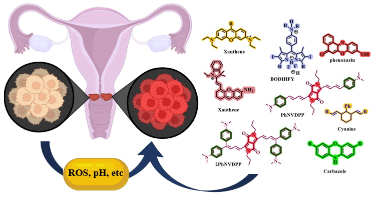 Organic near-infrared (NIR) fluorophores are being considered as next-gen tools for targeted imaging of HeLa cells and cervical cancer because they have less phototoxicity, less background autofluorescence, and better tissue penetration than traditional fluorophores. Through this review article, we have discussed how recent developments in rational molecular engineering have resulted in probes that are more attuned to particular tumor microenvironmental signals as viscosity, pH, reactive oxygen species, and enzyme overexpression. These probes are brighter, have larger Stokes shifts, and can be tuned through techniques like π-extension, donor-acceptor frameworks, heteroatom incorporation, and aggregation-induced emission algorithms. Potential platforms for image-guided therapy in cervical malignancies include BODIPY, carbazole, phenothiazine/phenoxazine, phenyl derivatives, and rhodamine/xanthene analogues. Early diagnosis, surgical guiding, and theranostic applications are just a few of the many uses for these platforms. Efforts within the scientific community to enhance clinical accuracy should focus on three key areas: (1) expanding the NIR-II window for fluorophore emission to improve tissue penetration and signal quality; (2) developing activatable probes specific to organelles; and (3) integrating these systems with cutting-edge optical imaging tools analysis. Nevertheless, there are still challenges to be solved, including issues with photostability, synthesis complexity, nonspecific interactions, water solubility, and gaps in the translation of results from preclinical models to human applications. These limitations must be overcome through systematic evaluation, scalable synthesis, and thorough safety profiling if organic NIR probes for imaging and treatment of cervical cancer can be quickly brought into clinical uses.